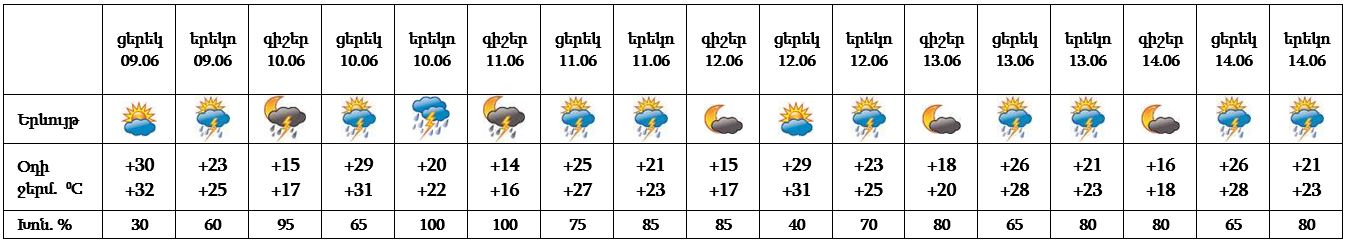 Հունիսի 9-ի երեկոյան ժամերին, 10-ի գիշերը, 12-ի կեսօրից հետո առանձին շրջաններում, 10-ի ցերեկը, 11-ին, 13-14-ը շրջանների զգալի մասում սպասվում է կարճատև անձրև և ամպրոպ, 10-ի և 13-ի ցերեկը, 11-ի գիշերն առանձին հատվածներում՝ ինտենսիվ, հնարավոր է նաև կարկուտ։