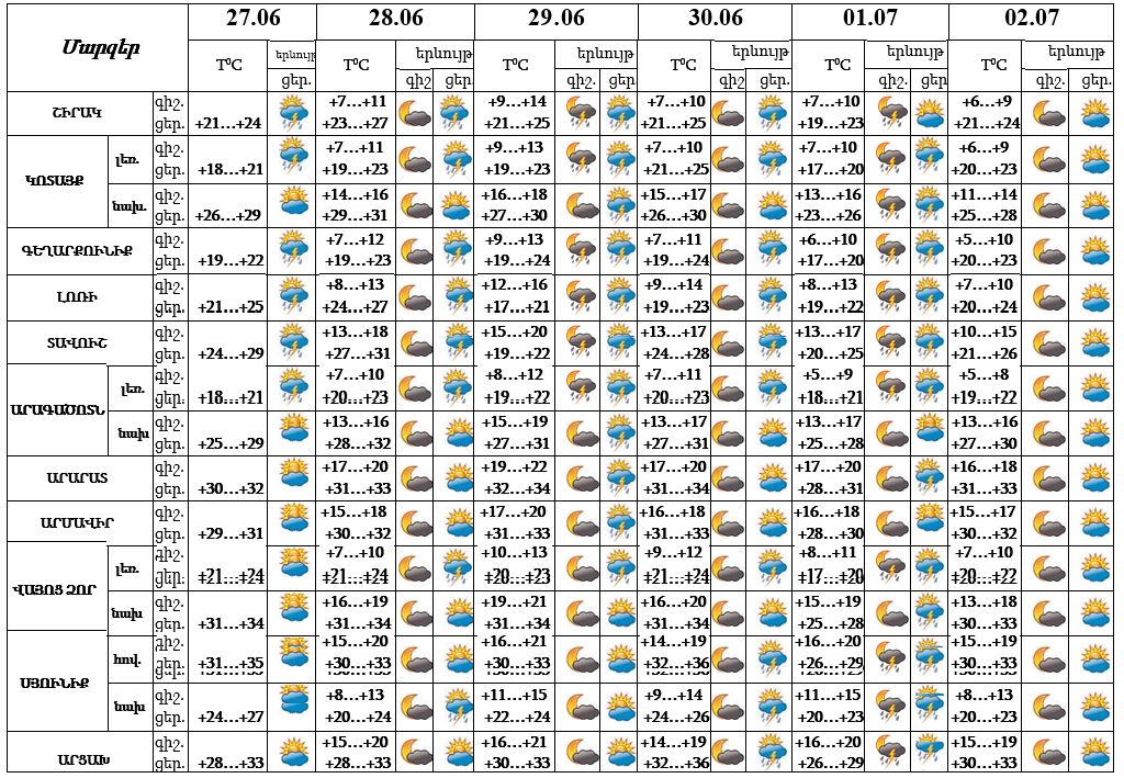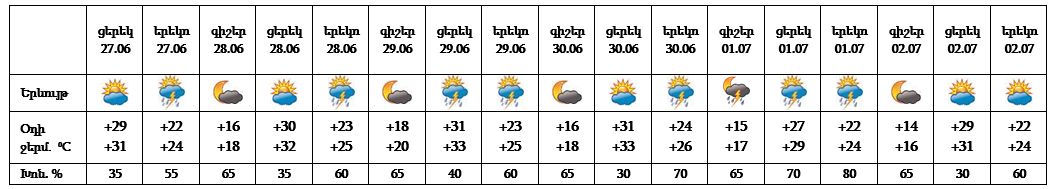 Հունիսի 27-ի ցերեկը, 28-30-ը, հուլիսի 1-ին առանձին շրջաններում սպասվում է կարճատև անձրև և ամպրոպ, առանձին հատվածներում հնարավոր է նաև կարկուտ։ Հուլիսի 2-ին սպասվում է առանց տեղումների եղանակ։