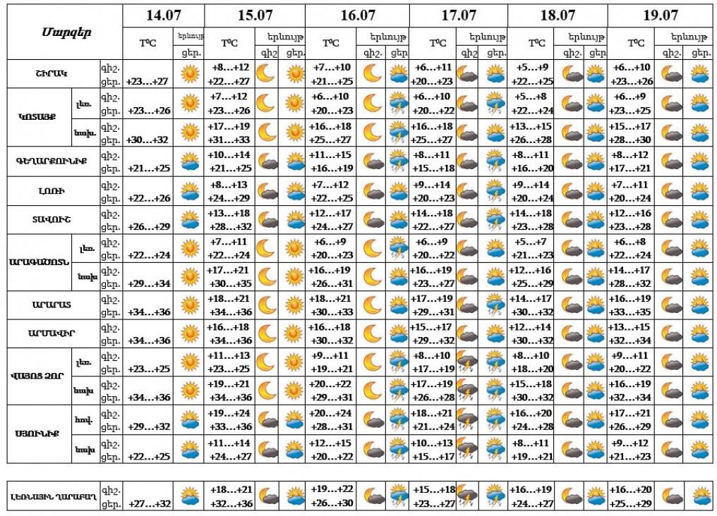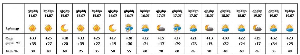 Հուլիսի 14-ի ցերեկը, 15-ին, 16-ի գիշերը, 18-19-ը սպասվում է առանց տեղումների եղանակ։ Հուլիսի 16-17-ը հնարավոր է կարճատև անձրև և ամպրոպ, ամպրոպի ժամանակ և երեկոյան ժամերին՝ քամու ուժգնացում՝ 17-20 մ/վ արագությամբ։