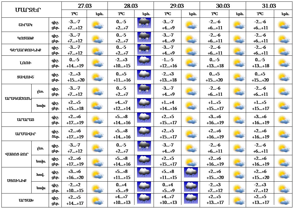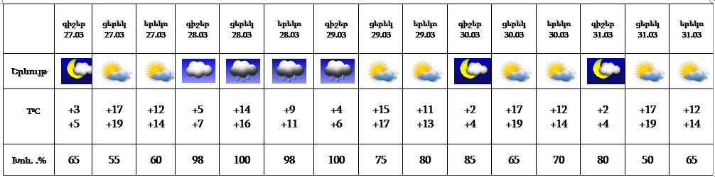 Մարտի 27-ին, 28-ի գիշերը, 29-ի ցերեկը, 30-31-ին սպասվում է առանց տեղումների եղանակ, 28-ին՝ օրվա երկրորդ կեսին, 29-ի գիշերը սպասվում է անձրև: