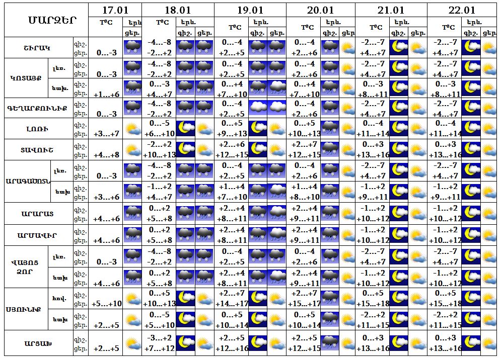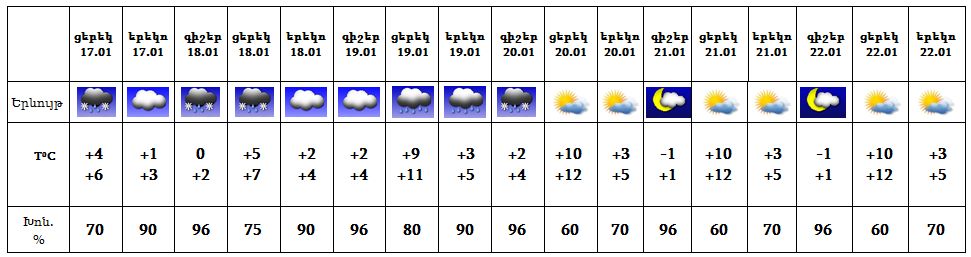 Հունվարի 17-ի ցերեկը, 18-19-ը, 20-ի գիշերը ժամանակ առ ժամանակ, դադարներով, հնարավոր են թույլ տեղումներ, գիշերները՝ թաց ձյան տեսքով, 20-ի ցերեկը, 21-22-ը սպասվում է առանց տեղումների եղանակ: