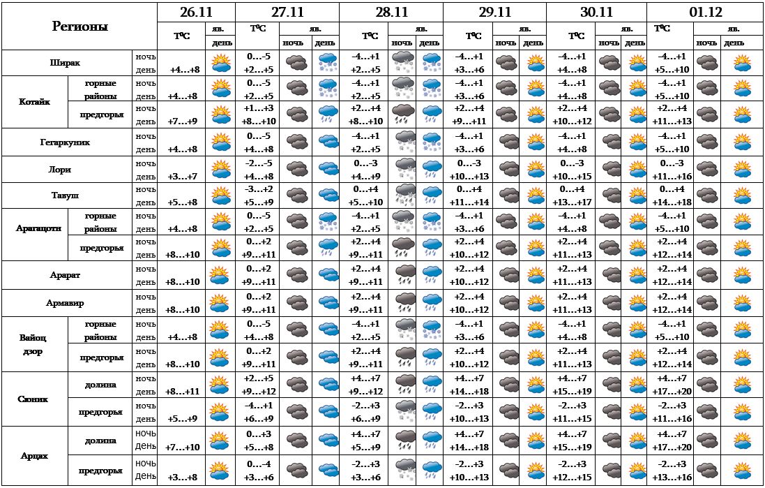 Ночью 27-го ноября температура воздуха везде повысится на 8-10 градусов, с 26-30 днем в марзах Лори, Тавуш, Сюник и в Арцахе постепенно повысится на 8-10, в остальных районах - на 4-5 градусов.