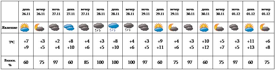 Днем 26-го, с 29-30 ноября, 1-го декабря ожидается погода без осадков, днем 27-го ноября в отдельных местах города возможен дождь, 28-го ожидается дождь.