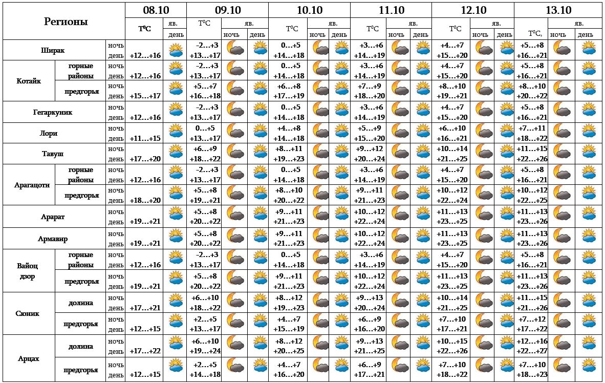 Днем 9-го октября, с 10-14 октября температура воздуха постепенно повысится на 4-5 градусов, а в Арцахе и регионах Лори, Тавуш, Сюник - на 8-10 градусов.