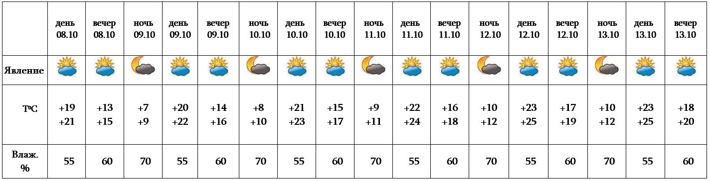 Днем 9-го октября и с 10-14 октября ожидается погода без осадков.