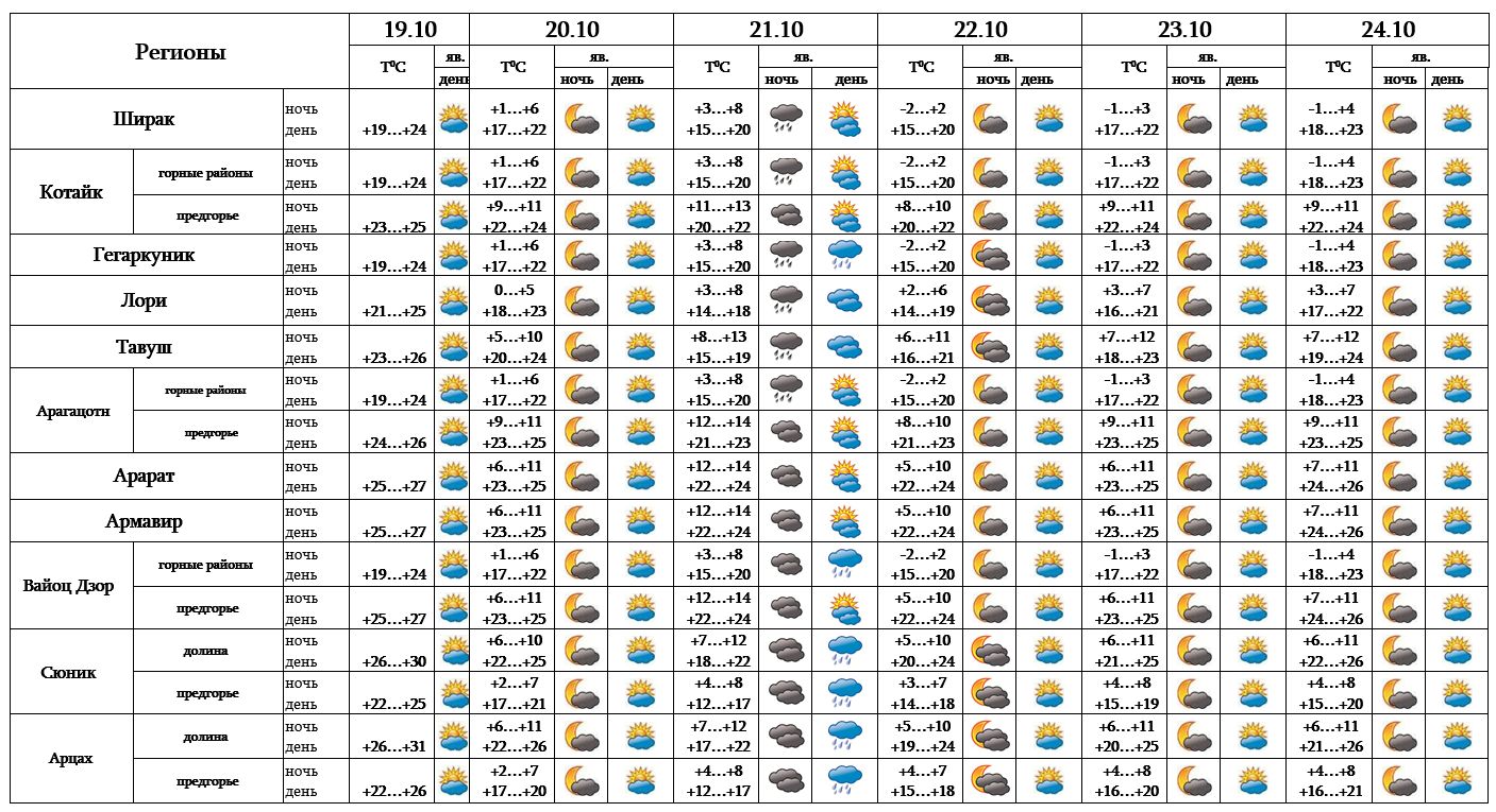 Днем 20 и 21 октября температура воздуха постепенно понизится на 2-4 градуса а в регионах Лори, Тавуш, Сюник и в Арцахе - на 6-8 градусов.