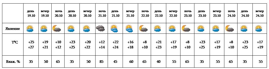 Днем 19-го октября, 20 и с 22-24 октября ожидается погода без осадков, 21-го октября в отдельных регионах ожидается дождь с грозой.