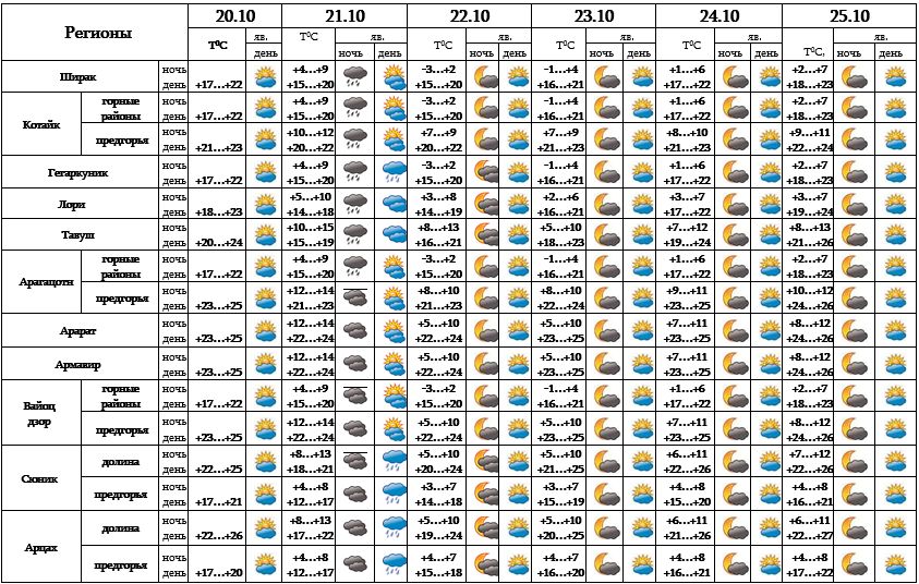 Днем 20-го и 21-го октября температура воздуха постепенно понизится на 2-4 градуса, а в Арцахе и регионах Лори, Тавуш, Сюник - на 6-8 градусов, с 23-25 - повысится на столько же.