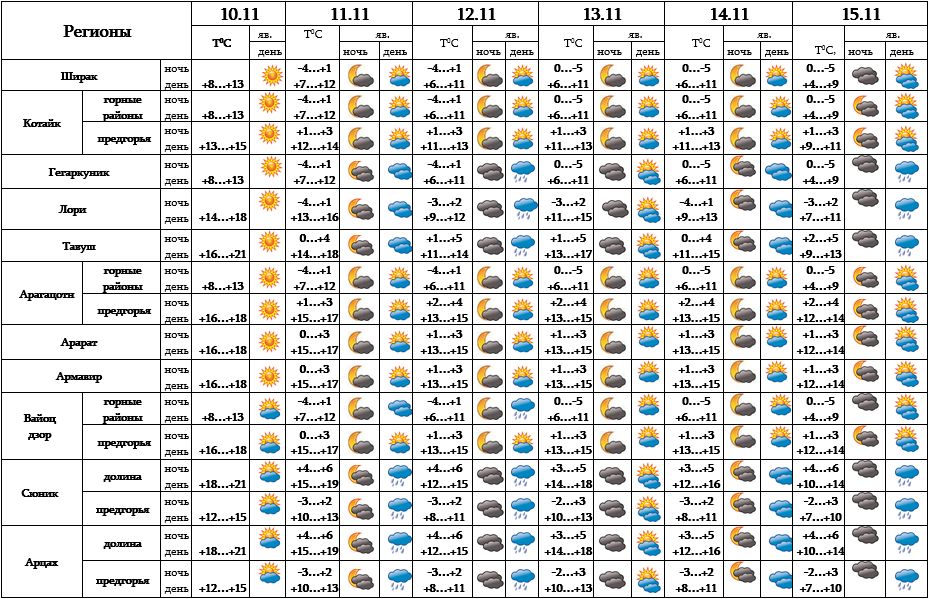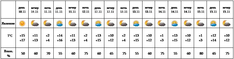 Днем 10-го ноября, ночью 11-го, 12-го, 15-го и с 13-14 ожидается погода без осадков, днем 11-го,12-го, 15-го в отдельных регионах ожидается дождь.