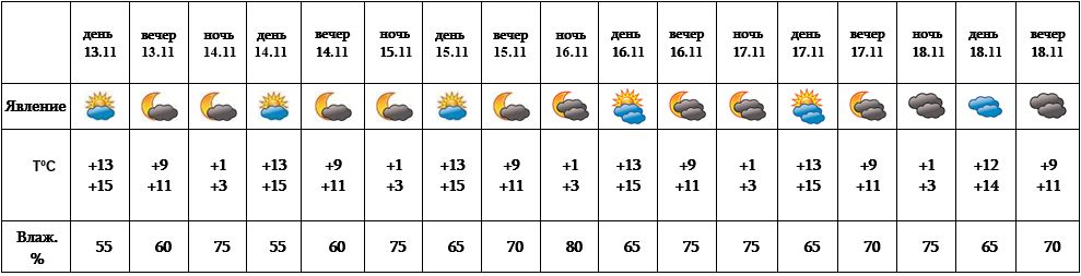 Днем 13-го ноября и с 14-18 ожидается погода без осадков.
