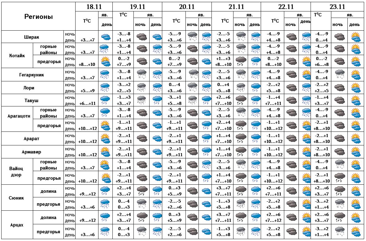 Температура воздуха днем с 18-19 ноября постепенно понизится на 2-3 градуса, в Арцахе и марзах Лори, Тавуш, Сюник - на 5-6 градусов.