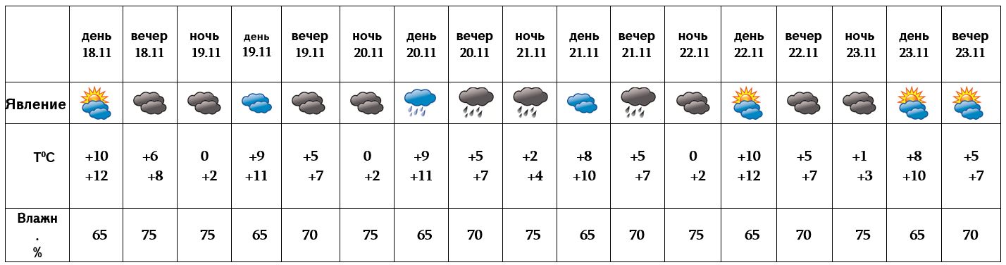 Днем 18-го ноября, 19-го и с 22-23 ожидается погода без осадков, а с 20-21 - ожидается дождь.