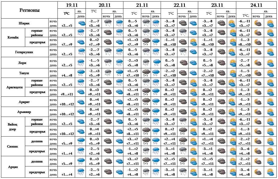 Днем 19-го ноября, 20-го, ночью 22-го в отдельных регионах, 21-го в большинстве регионов ожидаются осадки. Днем 22-го ноября, с 23-24 ожидается погода без осадков.