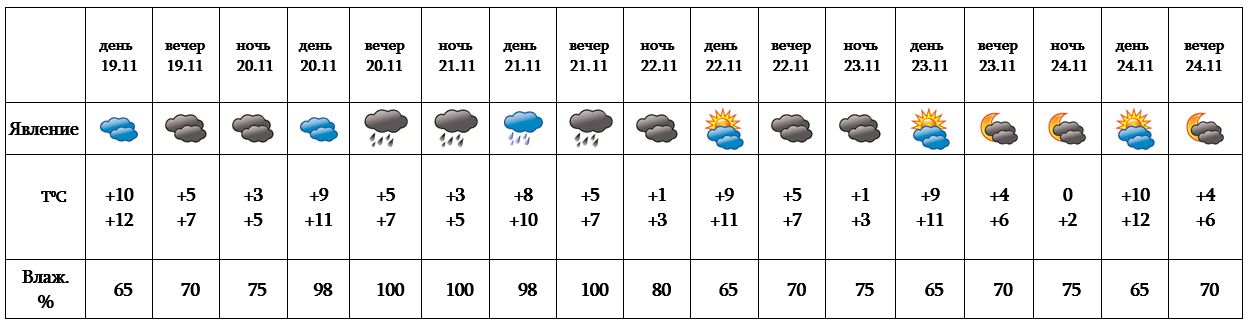 Днем 19-го ноября, с 22-24 ожидается погода без осадков, вечером 20-го, 21-го ожидается дождь.