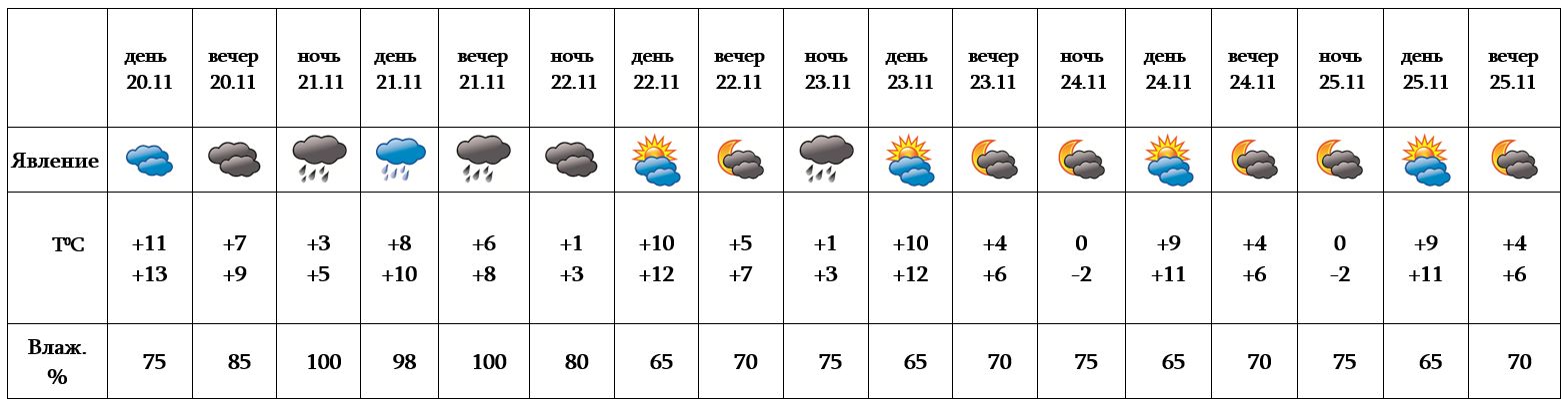 Днем 20-го ноября, 22-го, днем 23-го, с 24-25 ожидается погода без осадков, 21-го ноября, ночью 23-го ожидается дождь.