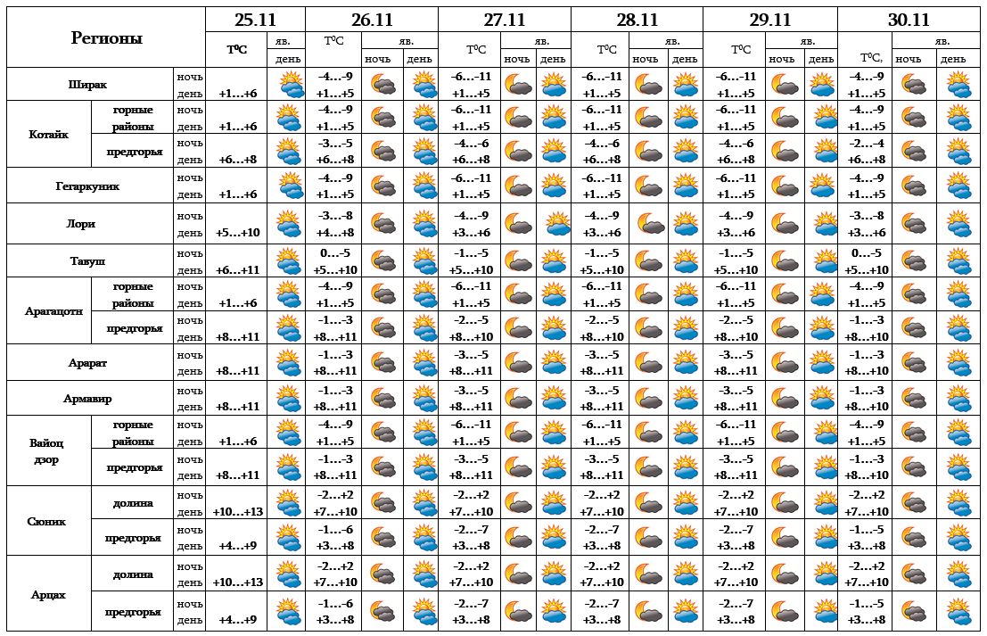 Днем 25-го и с 26-30 ноября ожидается погода без осадков.