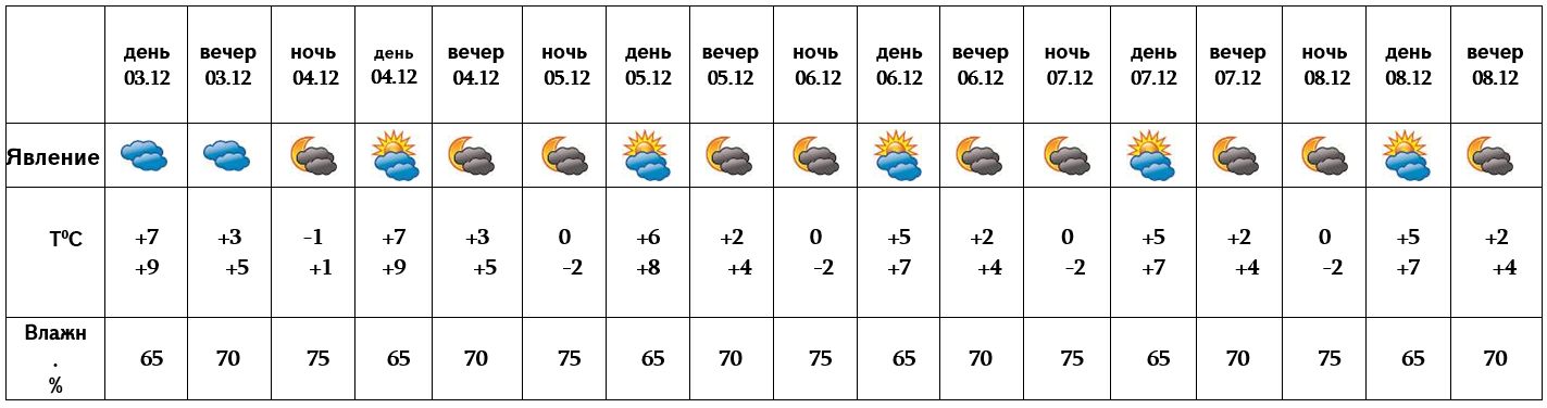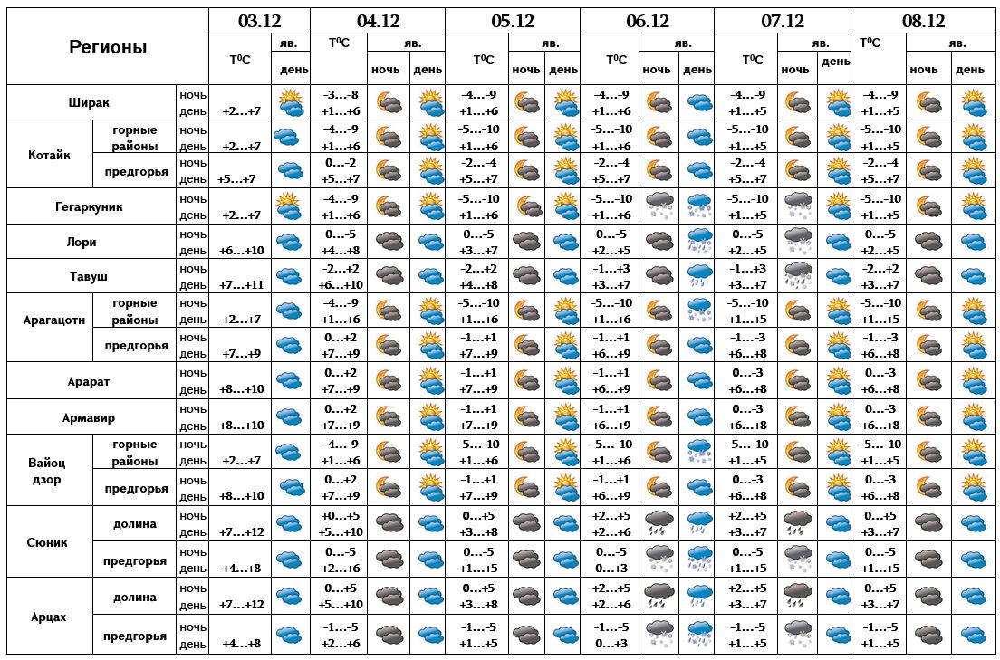 Днем 3-го декабря, с 4-5, 8-го ожидается погода без осадков, 6-го, ночью 7-го в отдельных районах ожидаются осадки, ночью и в утреннее время в отдельных местах - туман.