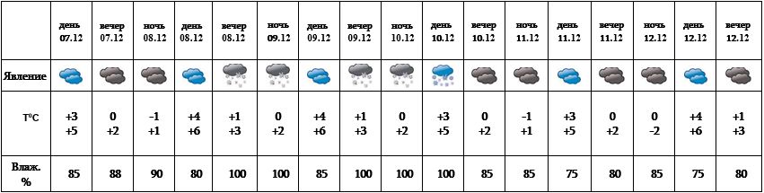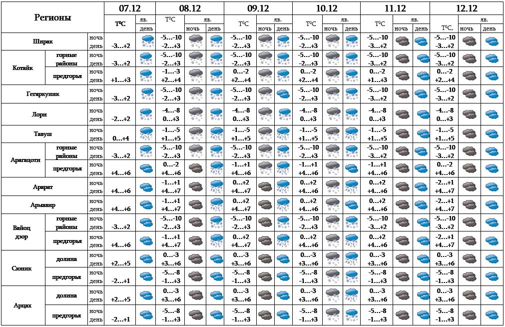 Днем 7-го декабря, с 8-10 время от времени ожидаются легкие осадки в виде мокрого снега. С 11-12 декабря ожидается погода без осадков. Ночью и в утреннее время ожидается туман.