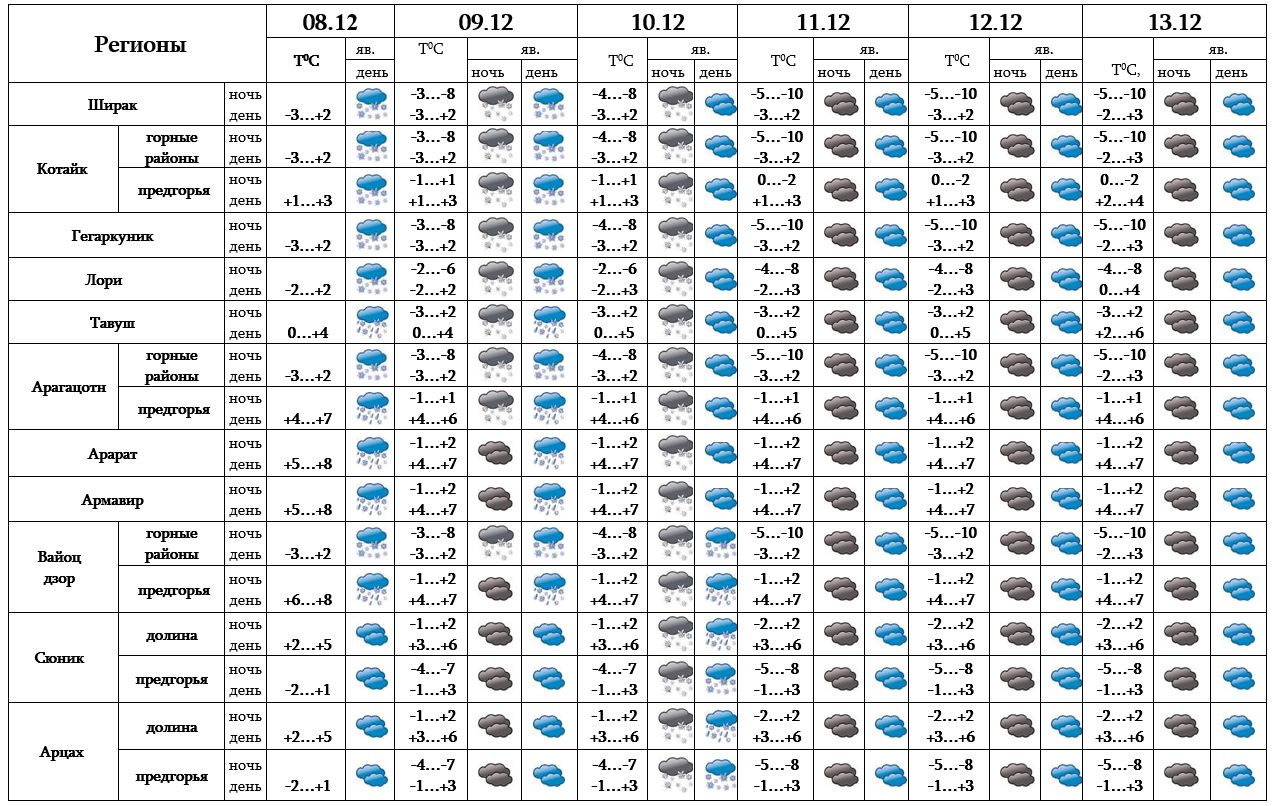 Днем 8-го декабря, 9-го в отдельных регионах, ночью 10-го в большинстве регионов, днем в Вайоц Дзоре и Сюнике время от времени ожидаются осадки, в горных и предгорных районах - в виде снега. С 11-13 декабря ожидается погода без осадков. В отдельных местах ночью и в утреннее время ожидается туман.