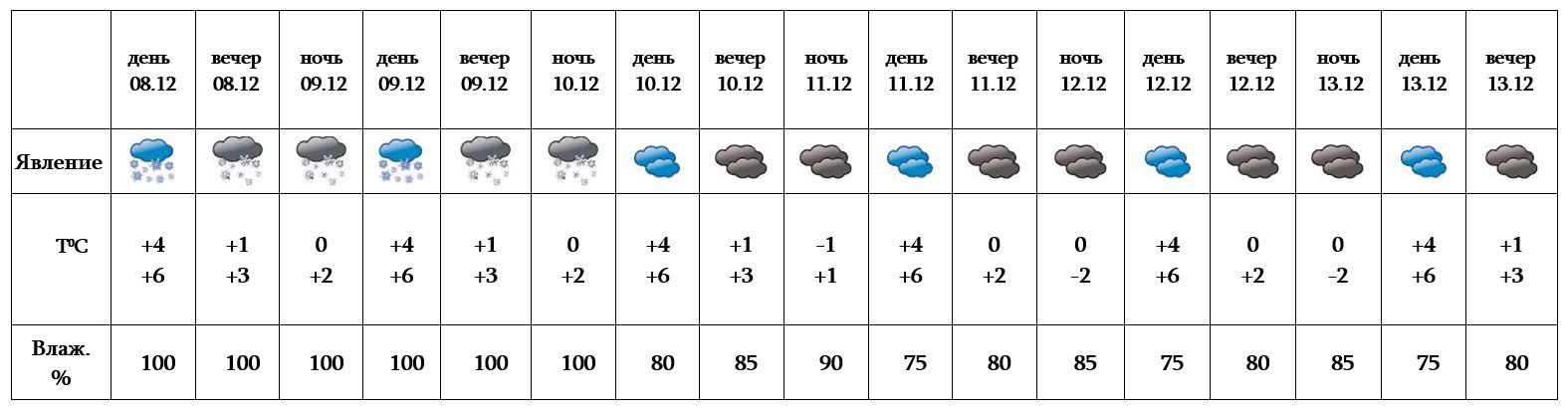 Днем 8-го декабря, 9-го, ночью 10-го время от времени ожидаются легкие осадки в виде мокрого снега. Днем 10-го декабря, с 11-13 ожидается погода без осадков. Ночью и в утреннее время ожидается туман.