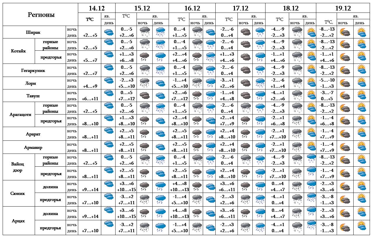 Днем 14-го декабря, 19-го ожидается погода без осадков, с 15-17, ночью 18-го в большинстве регионов, днем 18-го в регионах Вайоц Дзор, Сюник и в Арцахе ожидаются осадки, в горных районах - в виде снега. Ночью и в утреннее время в отдельных регионах ожидается туман.