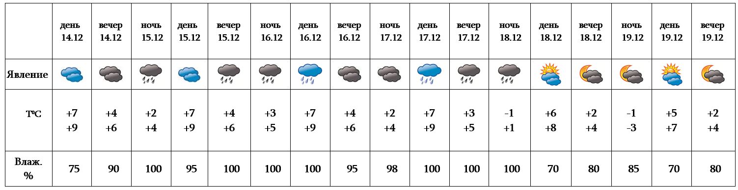 Днем 14-го и 18-го декабря, 19-го ожидается погода без осадков, с 15-17, ночью 18-го время от времени ожидаются осадки. Ночью и в утреннее время ожидается туман.
