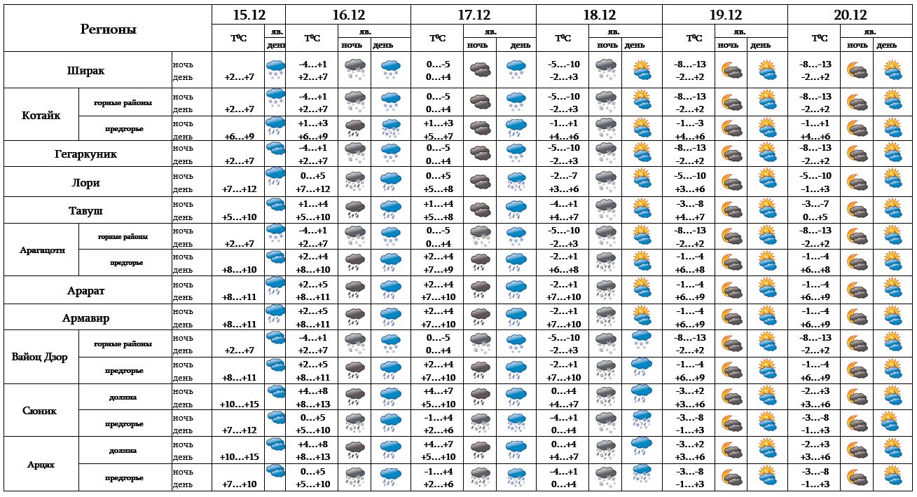 Днем 15-го декабря в отдельных регионах, с 16-17, ночью 18-го время от времени в большинстве регионов, днем 18-го в регионах Вайоц Дзор, Сюник и в Арцахе ожидаются осадки, в горных районах - в виде снега. С 19-20 декабря ожидается погода без осадков. В отдельных местах ожидается туман.