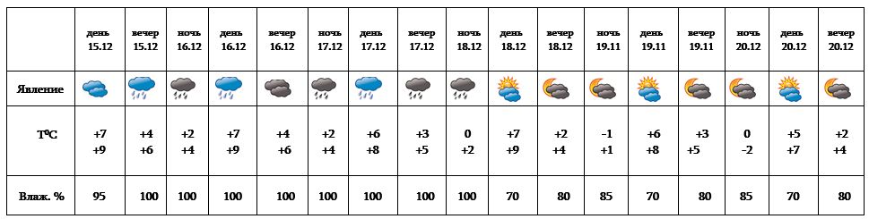Днем 15 декабря, с 16-17, ночью 18-го время от времени ожидается дождь. Днем 18 декабря, с 19-20 ожидается погода без осадков. Ночью и в утренние часы ожидается туман.