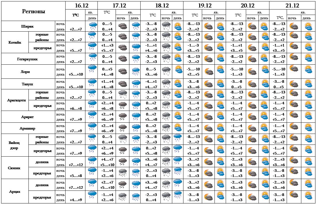 Днем 16-го декабря, 17-го, ночью 18-го время от времени в большинстве регионов, днем 18-го в регионах Вайоц Дзор, Сюник и в Арцахе ожидаются осадки, в горных районах и предгорьях - в виде снега. С 19-21 декабря ожидается погода без осадков. В отдельных местах ожидается туман.