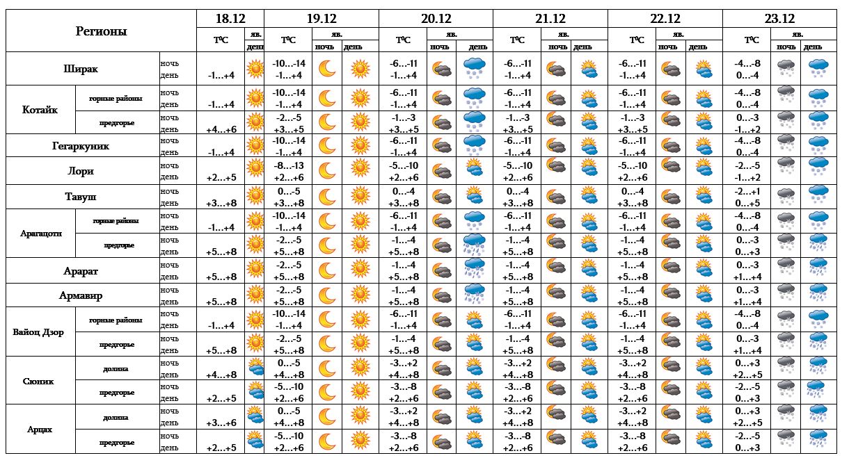 Днем 18-го декабря, 19-го, c 21-22 ожидается погода без осадков. Днем 20-го декабря в отдельных районах, 23-го в большинстве регионов ожидаются осадки, в горных районах и предгорьях - в виде снега.