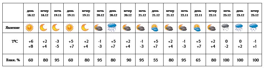 Днем 18-го декабря, 19-го, c 21-22 ожидается погода без осадков. Днем 20-го декабря, 23-го ожидаются осадки, в высокогорных районах - в виде снега.