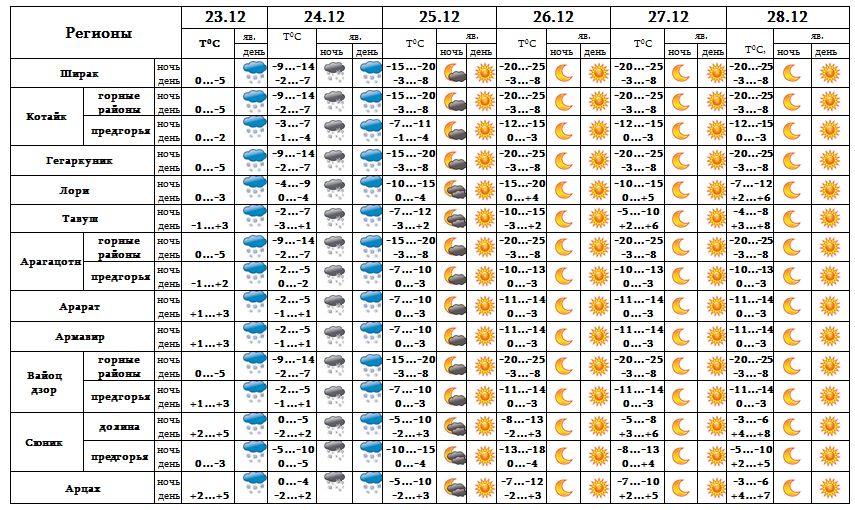 Днем 23-го, 24-го декабря в связи с проникновением активного циклона из Средиземного моря в республике ожидается снег, в отдельных местах - интенсивный, в горных районах и на перевалах - метель, ночью и утром на дорогах - гололедица.