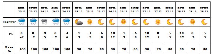Днем 23-го, 24-го декабря ожидается снег, ночью и в утренние часы на автодорогах - гололедица. С 25-28 ожидается погода без осадков.