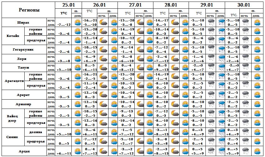 Днем 25-го и 30-го, с 26-28 января ожидается погода без осадков. 29-го, ночью 30-го января в большинстве регионов ожидается снег.