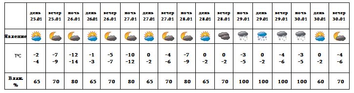 Днем 25-го и 25-го, с 26-28 января ожидается погода без осадков. 29-го, ночью 30-го января ожидается снег.