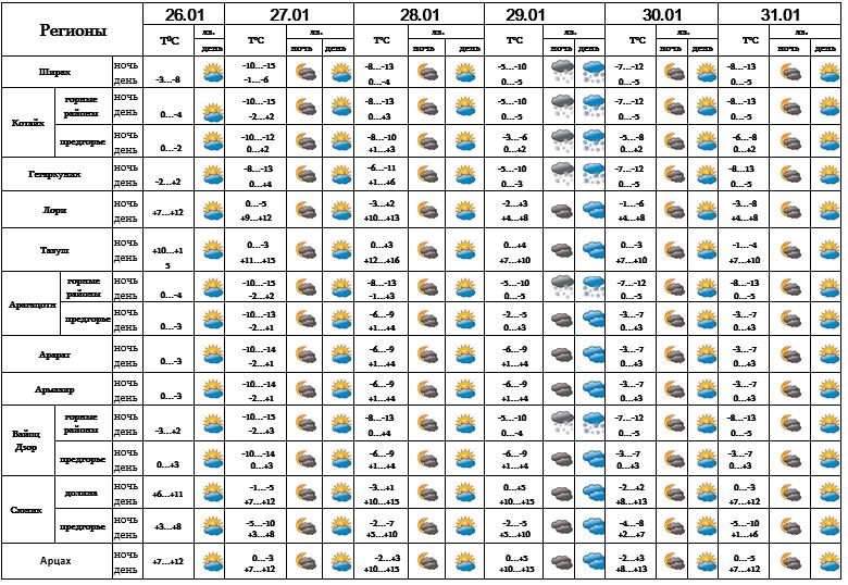 Днем 26-го, с 27-28, с 30-31 января ожидается погода без осадков. 29-го января в отдельных регионах ожидается снег.
