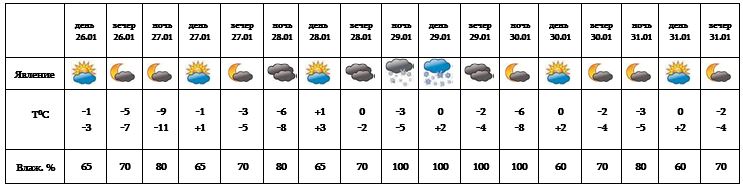 Днем 26-го, с 27-28, с 30-31 января ожидается погода без осадков. 29-го января ожидается легкий снег.