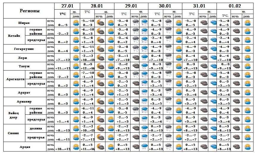 Днем 27-го и 30-го, 28-го, 31-го января, 1-го февраля ожидается погода без осадков. 29-го, ночью 30-го января в большинстве регионов ожидаются осадки.