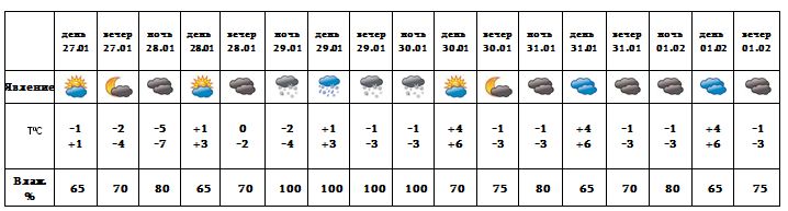 Днем 27-го и 30-го, 28-го, 31-го января, 1-го февраля ожидается погода без осадков. 29-го, ночью 30-го января ожидаются осадки.