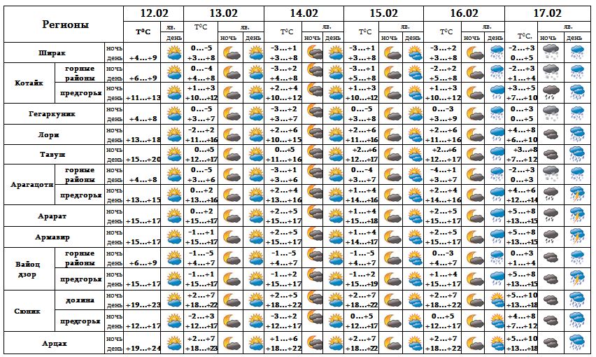Днем 12-го, с 13-15, ночью 16-го февраля ожидается погода без осадков. Днем 16-го февраля в отдельных регионах, 17-го в большинстве регионов ожидаются осадки․
