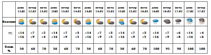 Днем 12-го, с 13-15, ночью 16-го февраля ожидается погода без осадков. Днем 16-го февраля ожидается дождь, 17-го ожидается дождь с грозой.