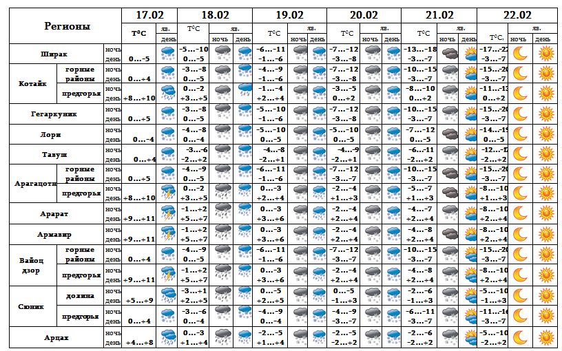 Днем 17-го февраля в регионах Ширак, Лори, Тавуш, в горных районах регионов Арагацотн, Котайк, Вайоц Дзор, в регионе Гегаркуник ожидается сильный снег, в отдельных районах - метель. В регионах Ширак, Арагацотн, Котайк, Гегаркуник и в Араратской долине ожидается усиление ветра с порывами до 25-30 м/с, а в городе Ереван – с порывами до 20-25 м/с.