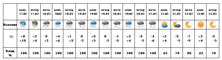 Днем 17-го февраля ожидается дождь с грозой, с 18-20, ночью 21-го - в виде мокрого снега. Днем 21-го, 22-го февраля ожидается погода без осадков.
