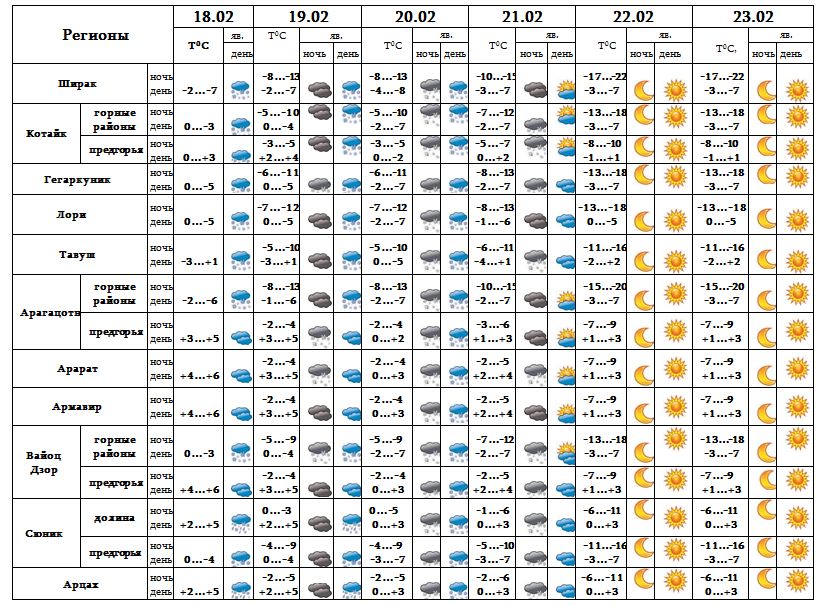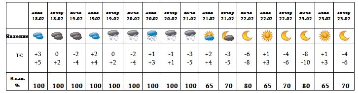 Днем 18-го, 19-го февраля время от времени ожидается слабый снег. 20-го, ночью 21-го февраля времени ожидается снег, днем 21-го, с 22-23 февраля ожидается погода без осадков.