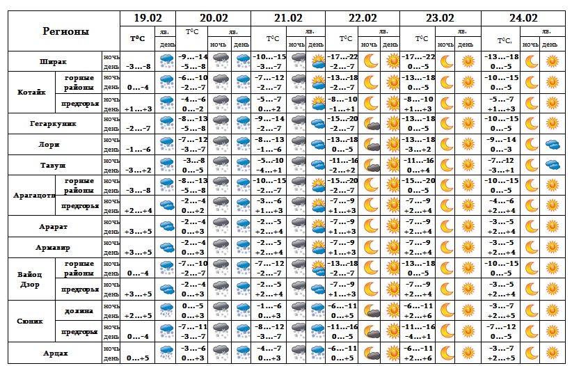 Днем 19-го февраля в отдельных регионах, 20-го, ночью 21-го в большинстве регионов, днем 21-го в регионе Сюник и Арцахе время от времени ожидается снег. С 22-24 февраля ожидается погода без осадков.