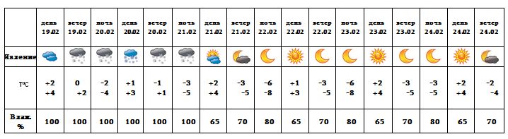 Днем 19-го февраля время от времени ожидается слабый снег. 20-го, ночью 21-го февраля время от времени ожидается снег. Днем 21-го, с 22-24 февраля ожидается погода без осадков.