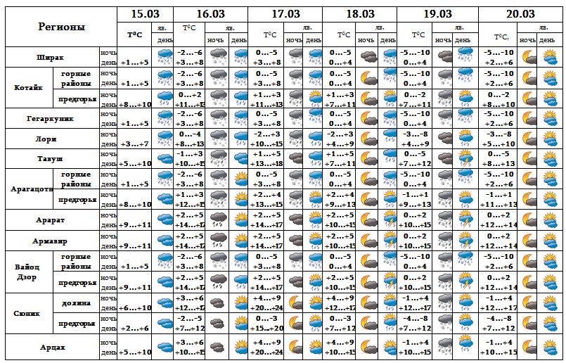 В вечерние часы 15-го, с 16-19 марта в отдельных регионах ожидаются кратковременные осадки, возможна гроза. 20-го марта ожидается погода без осадков.