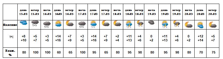 В вечерние часы 15-го, с 16-19 марта время от времени ожидаются кратковременные осадки, возможна гроза. 20-го марта ожидается погода без осадков.