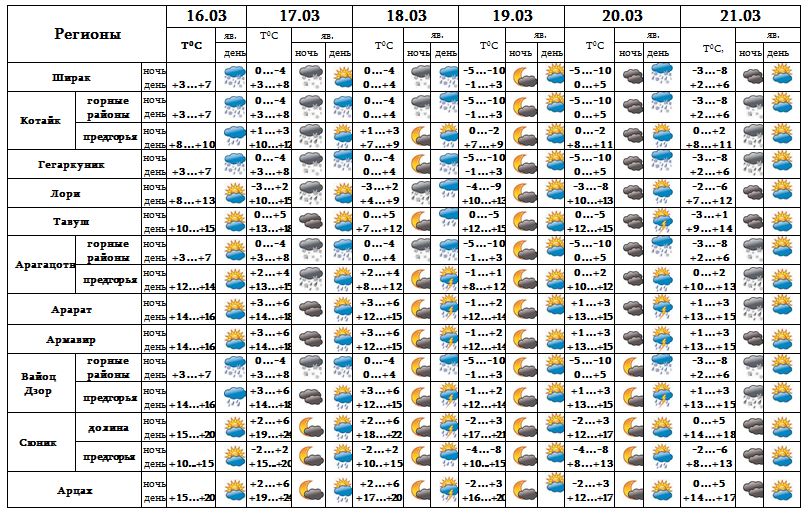 Вечером 16-го марта в отдельных местах города с 17-18, 20-21 время от времени օжидается кратковременный дождь, возможна гроза. 19-го марта ожидается погода без осадков.