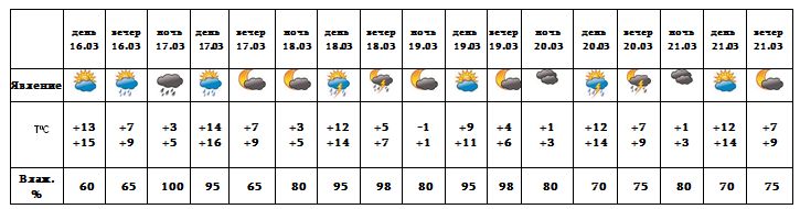 Днем 16-го, с 17-18. с 20-21 марта в отдельных регионах ожидаются кратковременные осадки, возможна гроза. 19-го марта ожидается погода без осадков.